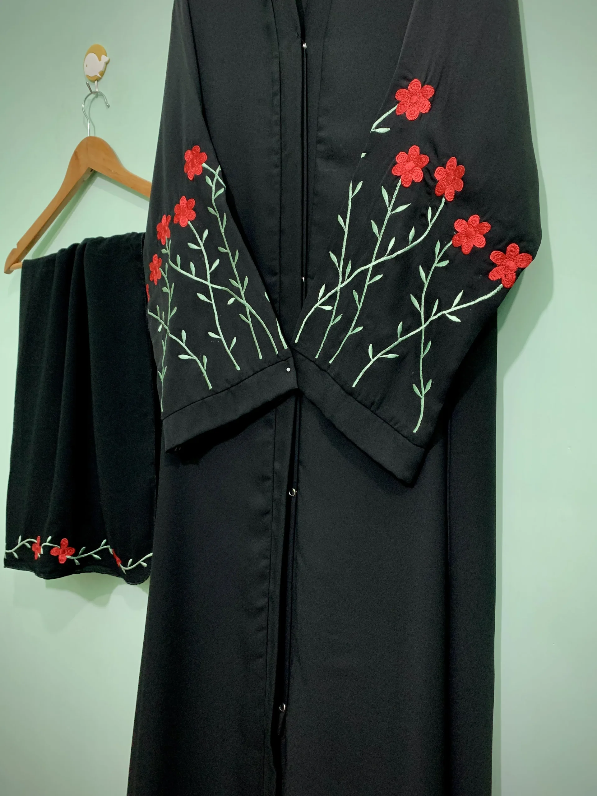 The Floral Charm Abaya is a graceful black abaya decorated with delicate red flower embroidery on the sleeves and hem. The green vine design adds a fresh and elegant touch, making it perfect for both casual outings and special occasions. Comes with a matching embroidered hijab for a complete look.