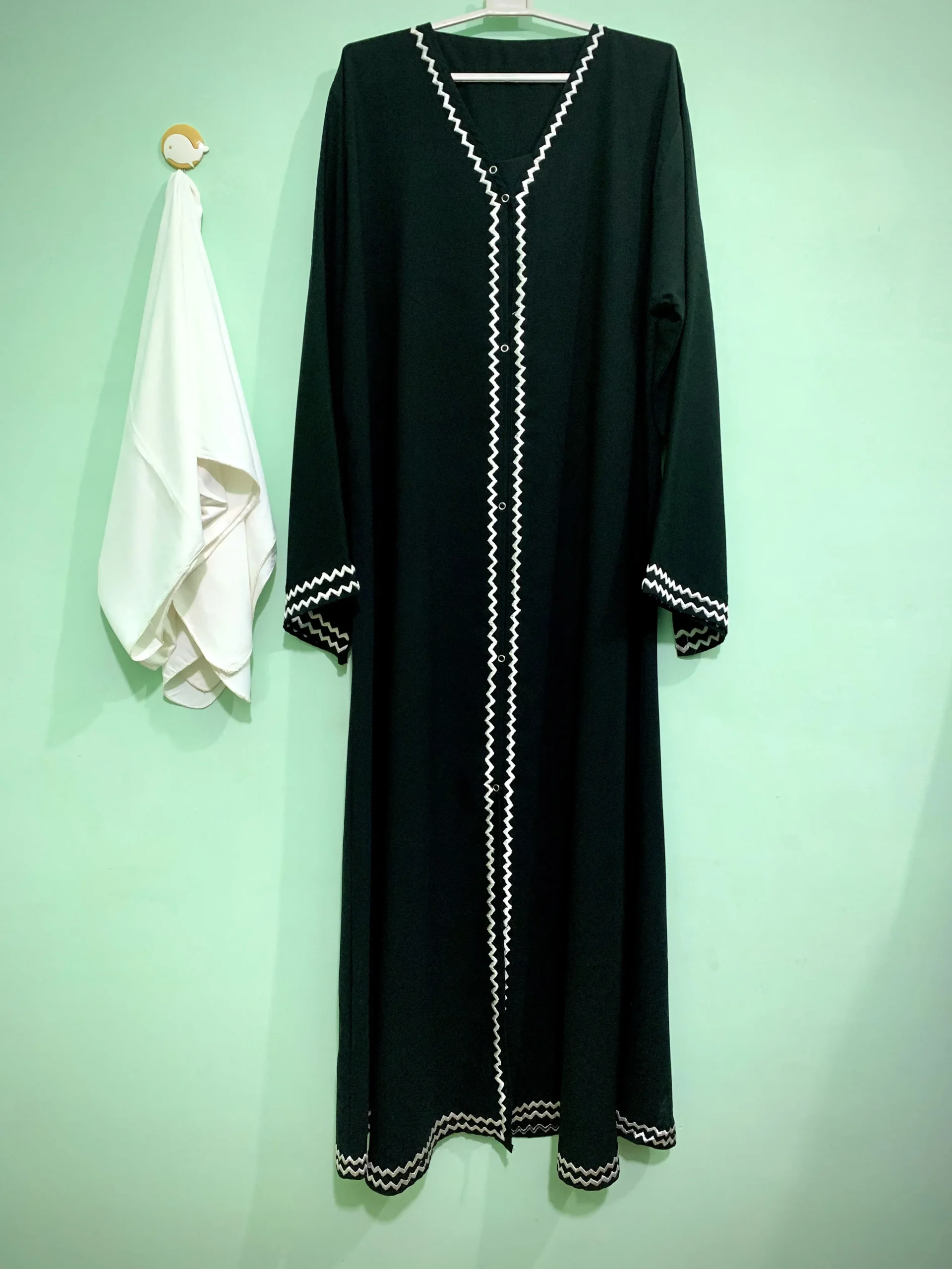 Simple and stylish, the Black Zigzag Abaya comes in a deep black color with white zigzag embroidery on the front, sleeves, and bottom. Made with soft fabric, it is comfortable to wear and perfect for any occasion.