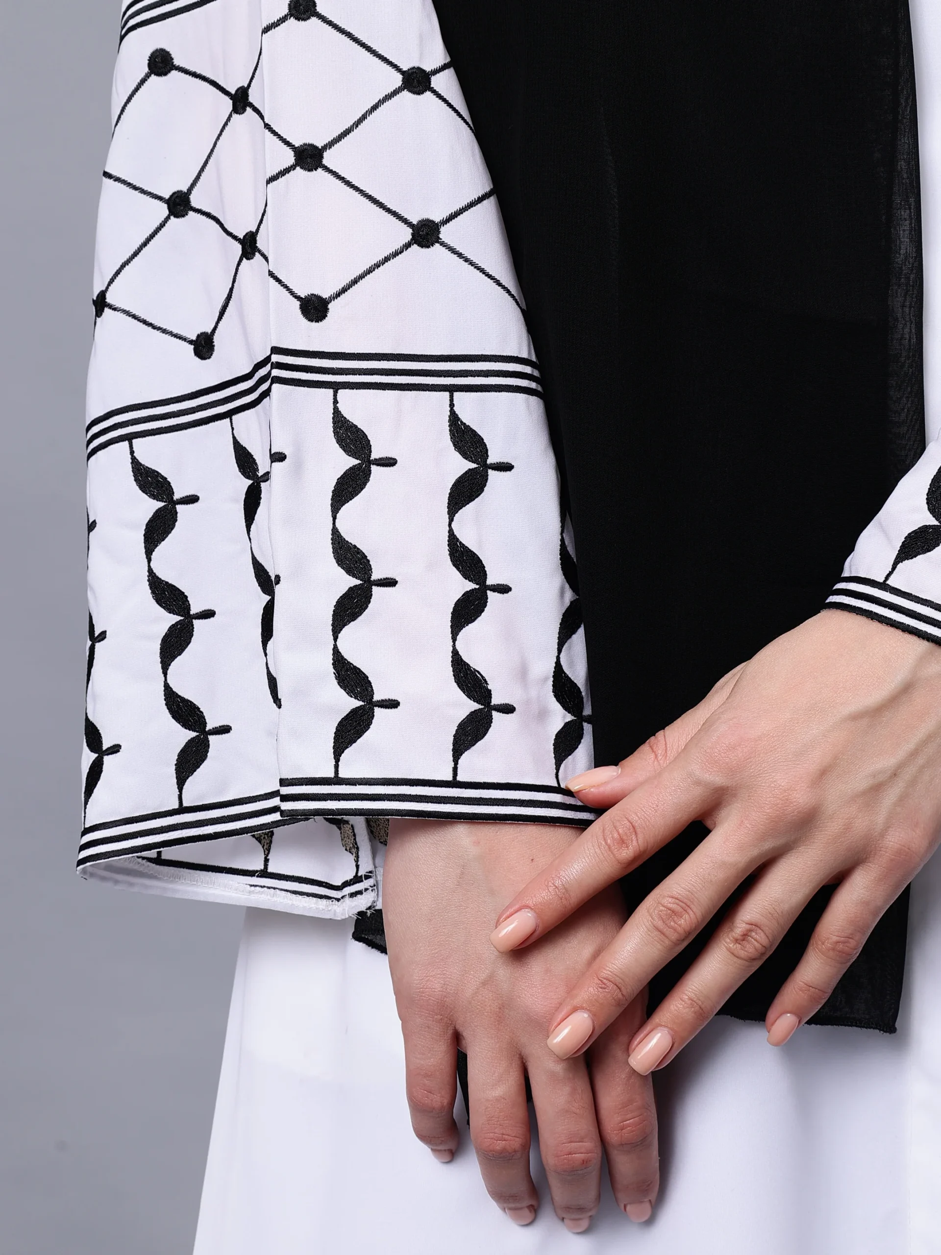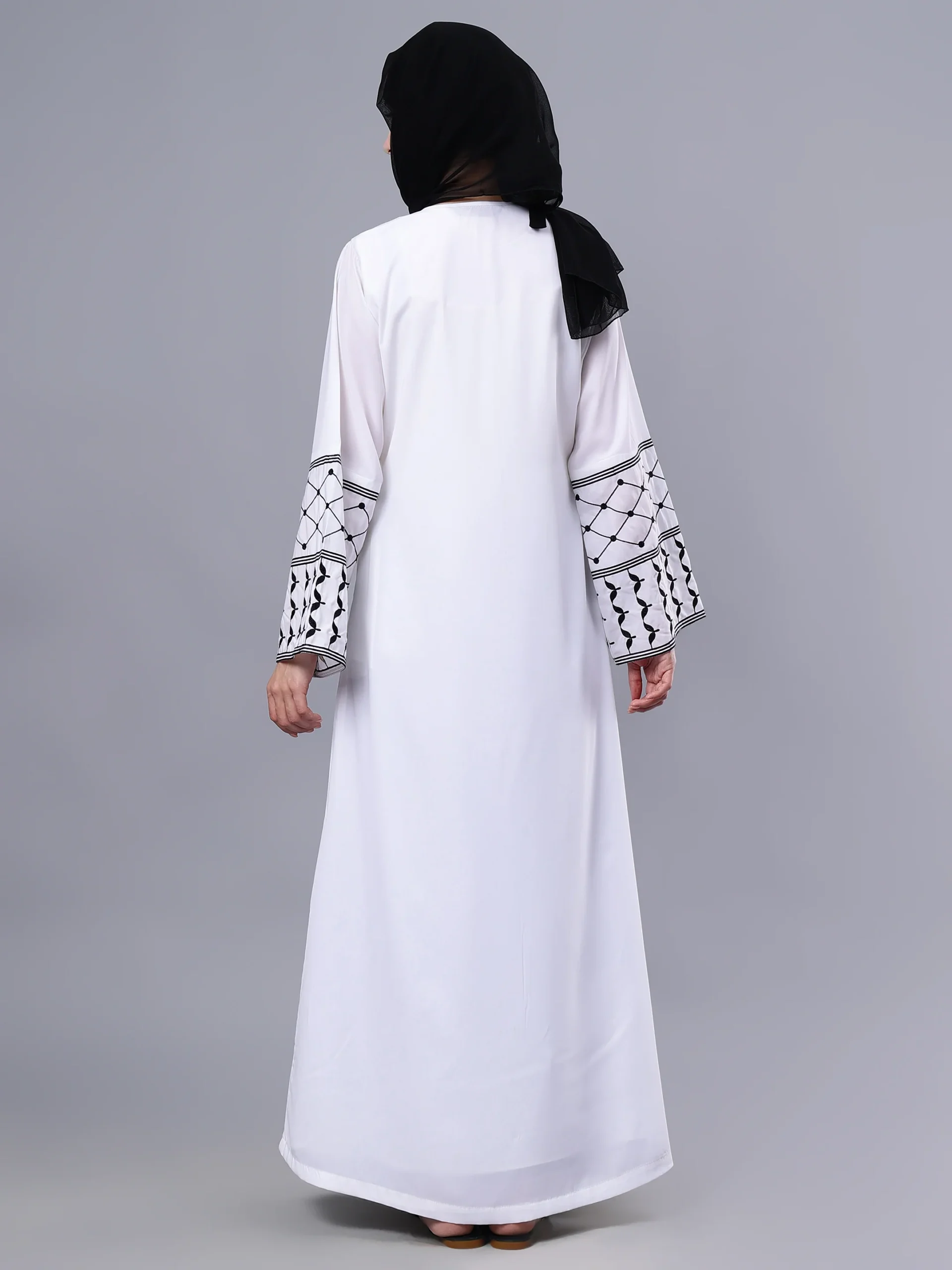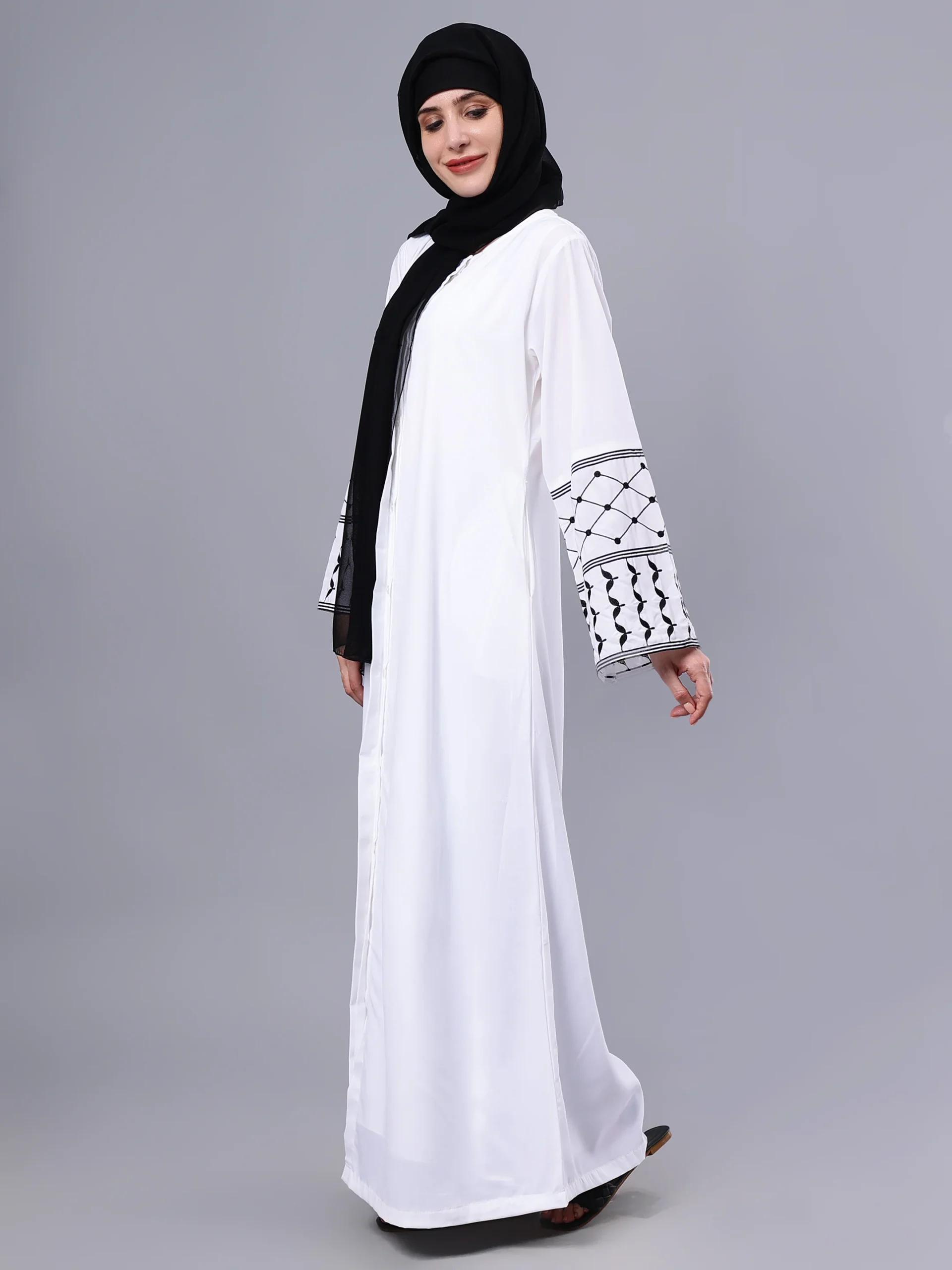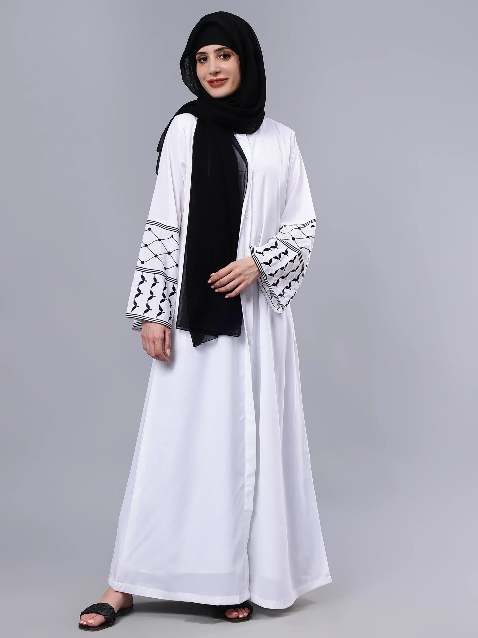 Crisp, artistic, and effortlessly bold, the Ivory Echo Abaya stands out with its clean white canvas and intricate black embroidery on the wide sleeves. Designed for those who love contrast and cultural flair, this piece blends tradition with a modern silhouette in premium Nida fabric.