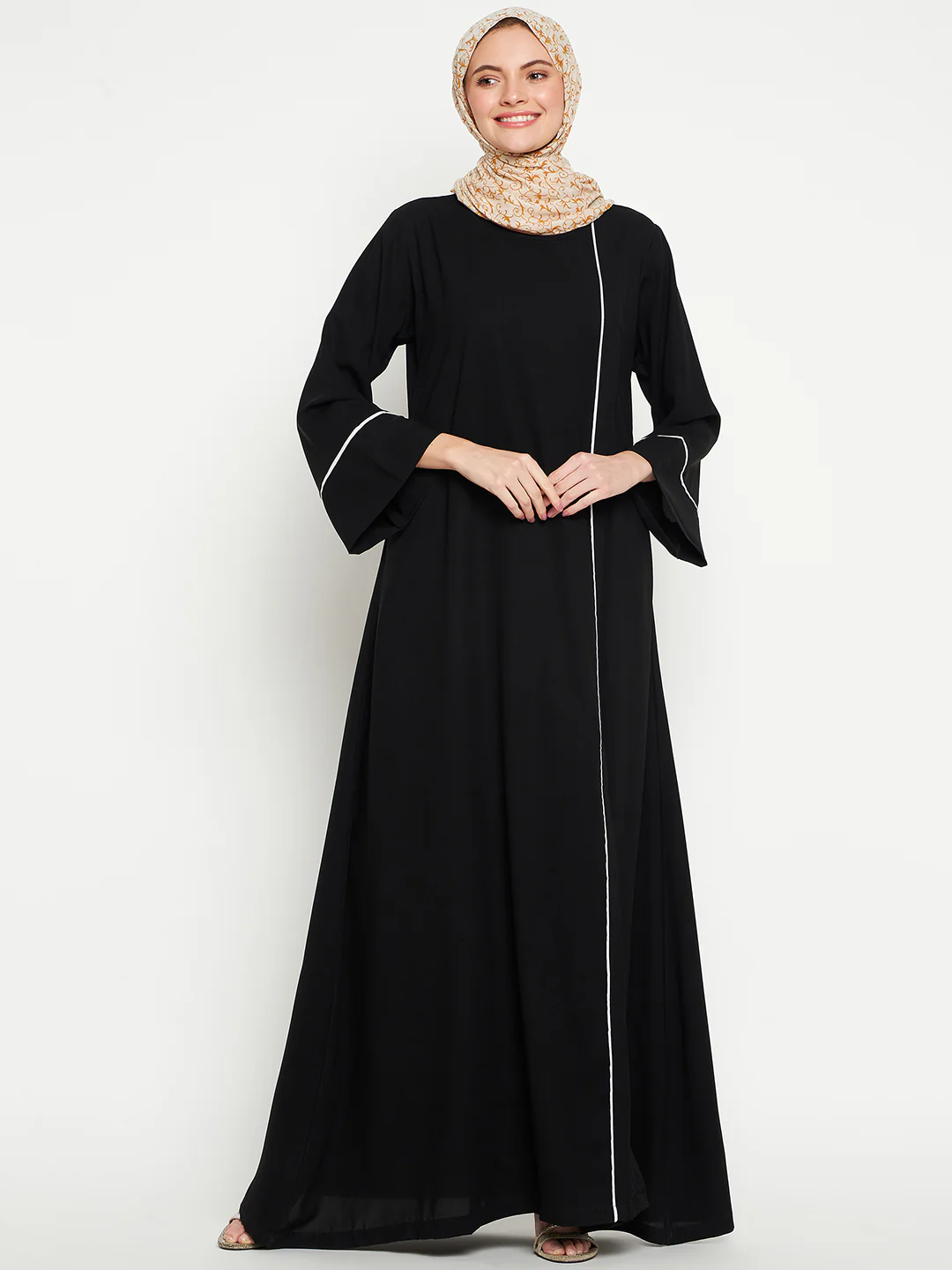 Simple yet striking, the Midnight Line Abaya is a refined choice for everyday elegance. Designed with clean white piping over deep black Nida fabric, it offers a graceful silhouette that suits both formal and casual wear. The flared sleeves add a touch of modern modesty to your wardrobe.