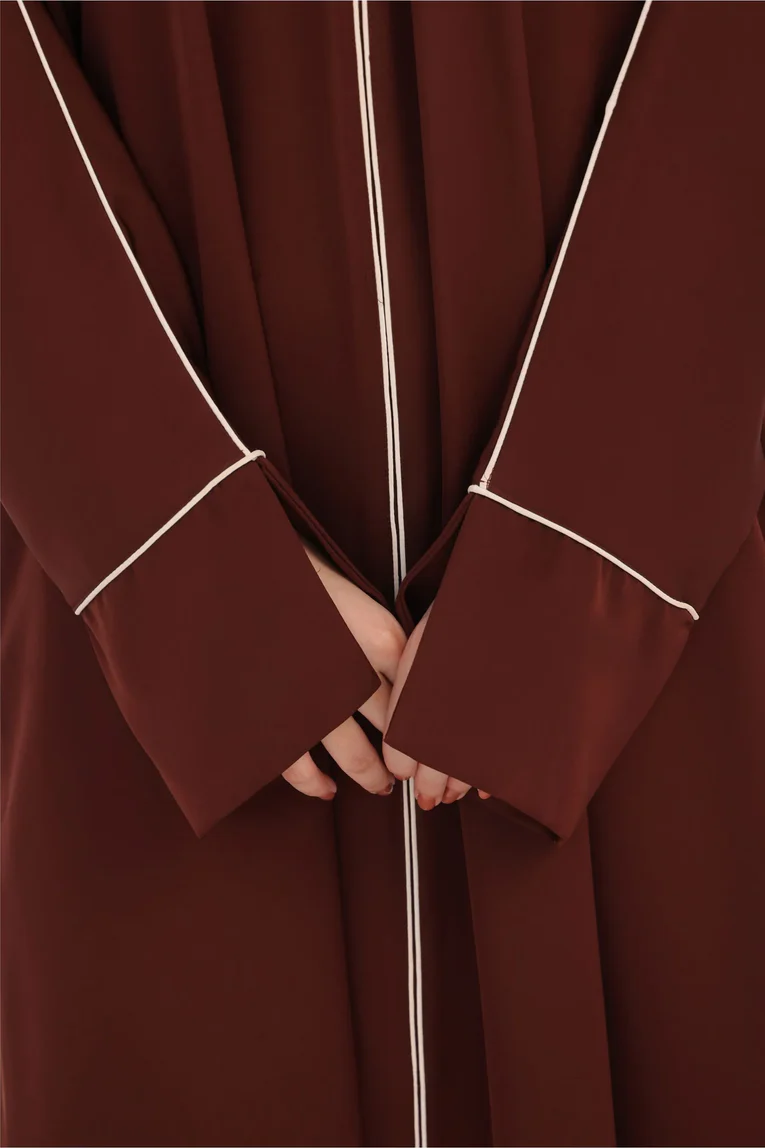 Minimal, modern, and effortlessly chic — the Mocha Flow Abaya showcases a rich coffee brown tone with soft white piping along the sleeves and neckline. Its loose fit and premium Nida fabric make it a breathable, stylish choice for any season. A perfect blend of casual grace and everyday ease.