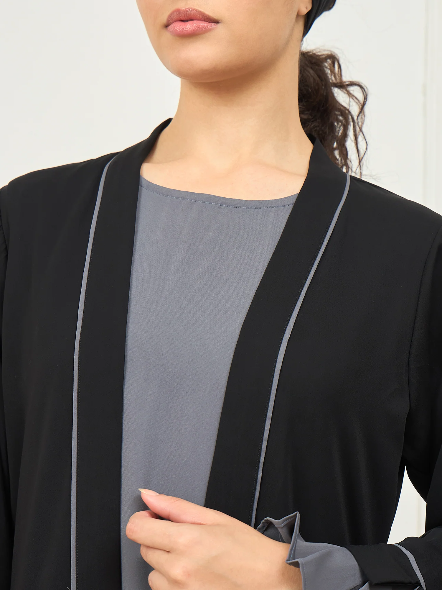 Chic, structured, and effortlessly elegant — the Shadow Grace Abaya blends classic black with a cool grey panel and ruffled sleeves for a standout look. Designed for the modern modest woman, this piece offers fluid movement with premium Nida fabric and a sophisticated edge that works from day to night.