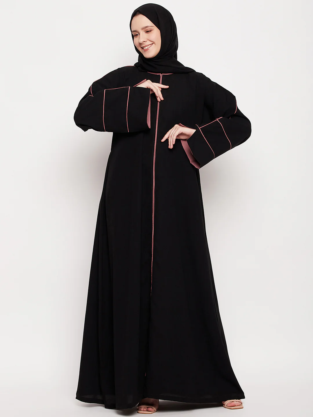Elevate your modest wardrobe with the Noir Blush Abaya — a timeless black ensemble adorned with delicate blush pink piping. The wide sleeves and sleek cut offer both grace and comfort, making it perfect for any occasion.